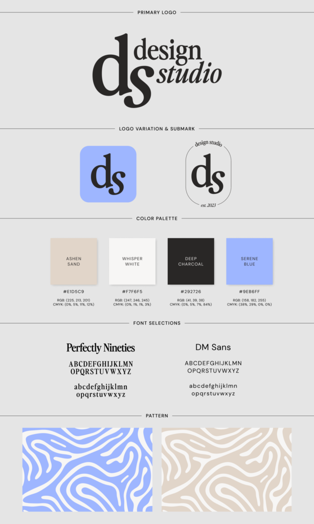 When developing my personal brand, I aimed to align it closely with my design preferences and personality. I chose a playful serif display font to reflect my sense of humor and creativity, while still maintaining a professional demeanor. Opting for a serif with more display font properties added a touch of bubbly charm to the overall look. The color palette was inspired by a striking blazer I wear in my website pictures; its captivating hue became the cornerstone of my branding. Starting with muted tones of beige, white, and black, I found the perfect accent color in the blazer, completing the palette. Additionally, I incorporated a repeating pattern of simple squiggly lines, injecting a touch of whimsy into the design. My branding aims to convey authenticity and genuineness, reflecting my values as a person and a professional.